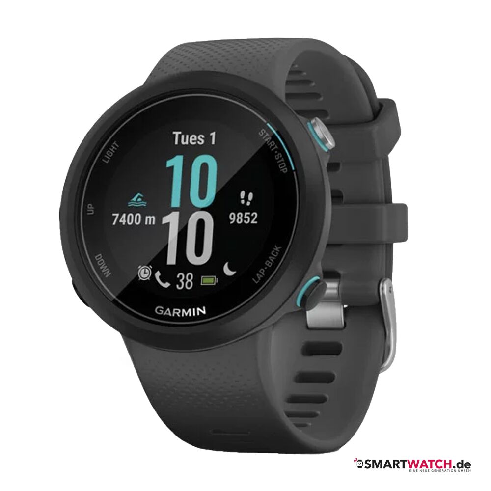 Die Bedienung der Fitness Uhr gelingt stattdessen über insgesamt fünf Tasten, von denen sich zwei auf der rechten und drei auf der linken Seite des Gehäuses befinden. Der Gehäusedurchmesser der Garmin Swim 2 beträgt 42 Millimeter. Sie ist gemäß ihrer Bestimmung bis zu 50 Meter wasserdicht.