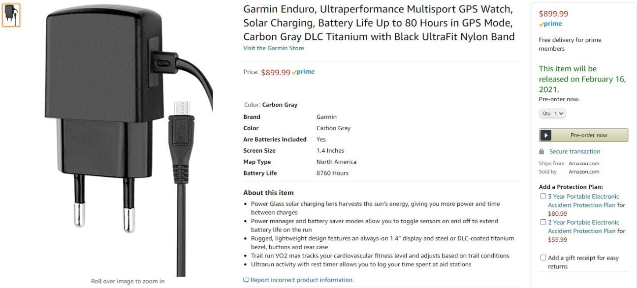 Wie schon bei der Lily startet Garmin mit der Enduro eine komplett neue Serie und erweitert damit sein ohnehin bereits sehr umfangreiches Sportuhren-Portfolio. Nachdem diese bevorstehende Neueinführung zwischenzeitlich im US-Amazon-Shop gelistet war, ist sie von dort wieder verschwunden. Aufmerksame Nutzer haben allerdings einen Screenshot erstellt und ihn auf „Reddit“ geteilt. Dementsprechend lässt sich bereits einiges über die Garmin Enduro sagen.