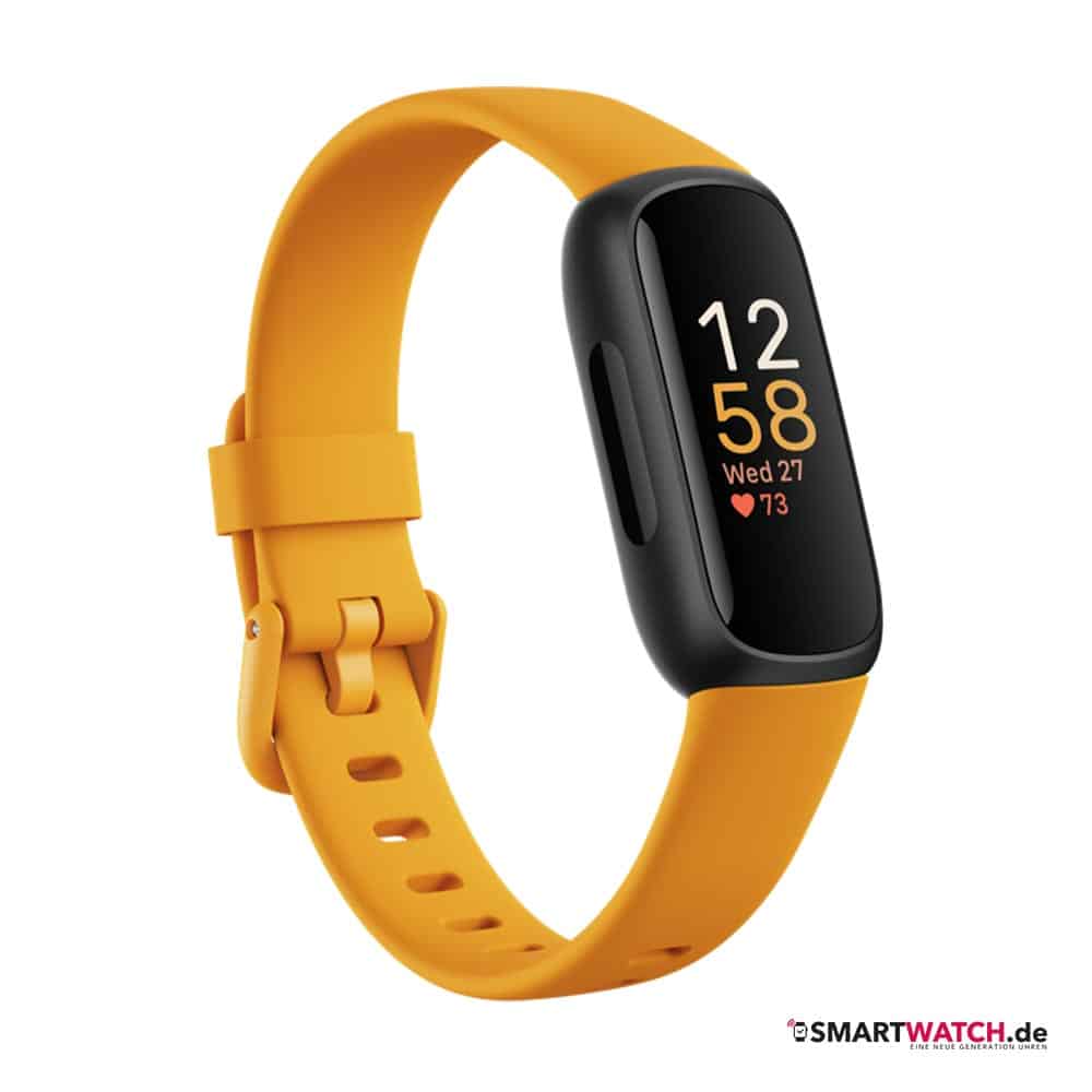 Das Fitbit Inspire 3 steht in drei grundlegenden Ausführungen zur Auswahl. Eine besonders neutrale Variante zeigt sich vollkommen in Schwarz. Die gleiche Farbe hat auch das Gehäuse der anderen Modelloptionen erhalten. Dazu kombiniert der Hersteller einmal ein gelbes und einmal ein orangerotes Armband. Dieses besteht standesgemäß aus Silikon und lässt sich bei Bedarf auswechseln. Fitbit hält dafür eine breite Palette bereit.