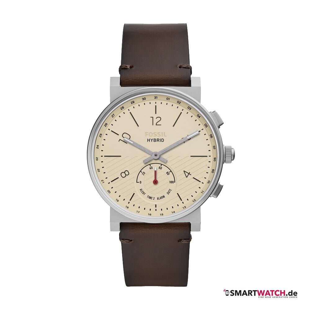 Die Fossil Barstow ist eine weitere Hybrid Smartwatch des Uhrenherstellers aus Richardson, welche die männliche Zielgruppe anspricht. Sie erschien 2019 und gibt sich in unterschiedlichen Ausführungen zu erkennen. Dabei haben die Herren die Wahl zwischen mehreren Gehäusefarben sowie diversen Armbändern. Wie gewohnt, lässt sich die intelligente Uhr problemlos mit dem Smartphone koppeln – ob Apples iPhone oder ein Android Modell, spielt dabei keine Rolle. Mit beiden Betriebssystemen ist sie kompatibel. Sie sammelt Daten zur körperlichen Aktivität, zeichnet den Schlaf auf und benachrichtigt zu Mitteilungen sowie Anrufen, die auf dem Mobiltelefon eintreffen. Als Fernbedienung für das Handy lässt sie sich ebenso zum Einsatz bringen. Letztlich schafft es das stilvolle Accessoire auf eine Batterielaufzeit von rund sechs Monaten.