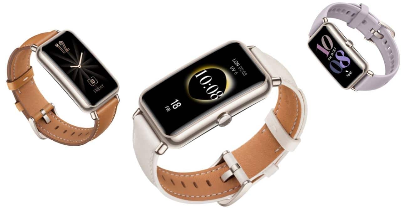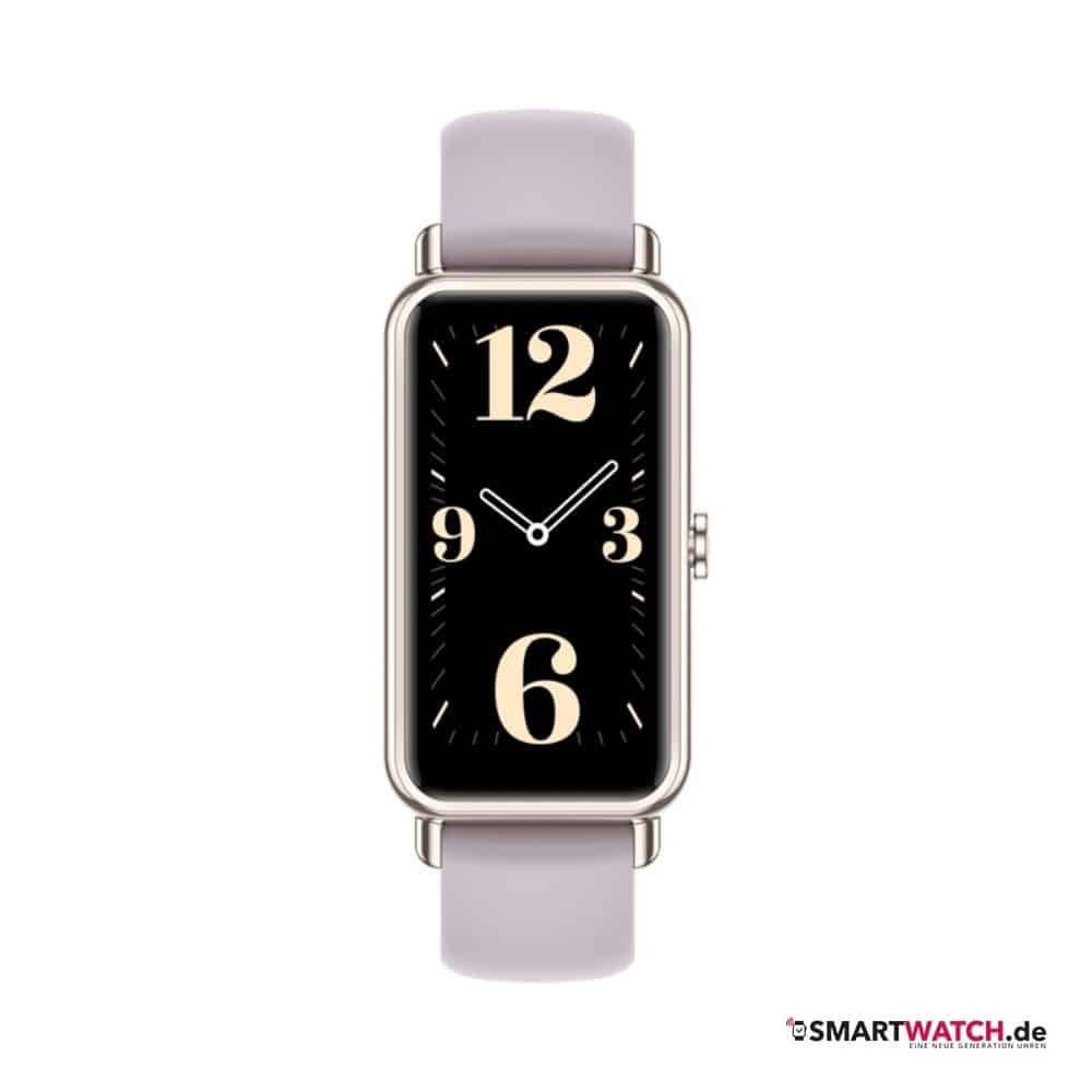Drei Ausführungen stehen den Damen zur Auswahl. Sie alle haben eine goldene Gehäusefarbe als gemeinsames Merkmal. Dazu kombiniert HUAWEI verschiedene Armbänder. Eines besteht aus Fluorelastomer und ist in einen Fliederton getaucht. Die anderen beiden Exemplare haben jeweils ein Lederarmband erhalten, von denen sich eines in Braun und das andere in Weiß präsentiert. Während die Breite der Lederbänder bei 14 Millimetern liegt, fällt das Kunststoffband mit 16 Millimetern geringfügig breiter aus.