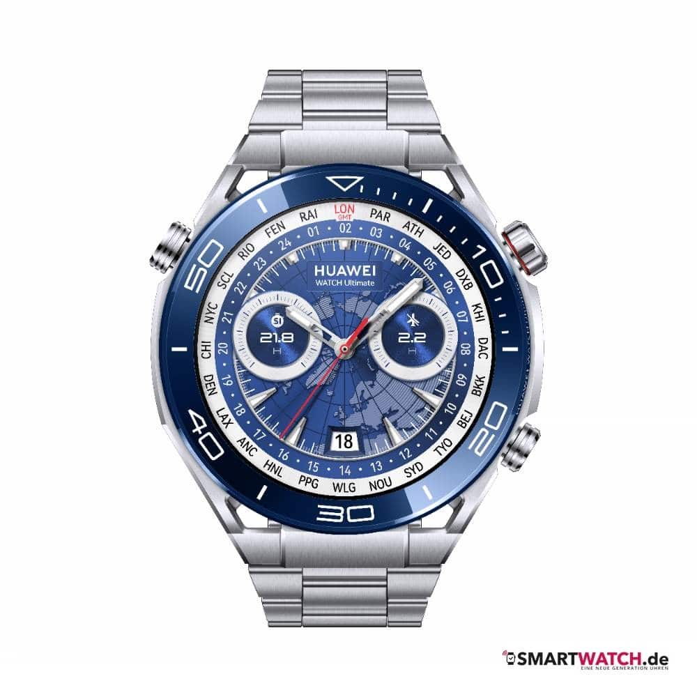 Eine besonders hochwertige Smartwatch mit einem reichhaltigen Funktionsumfang steckt in der HUAWEI Watch Ultimate. Die intelligente Uhr wartet mit einem außergewöhnlich großen 1,5-Zoll-Display auf und besteht aus widerstandsfähigen Materialien wie Keramik, Titan und Saphirglas. Sie ist wasserdicht bis zu 100 Meter, sodass sie nicht nur von Schwimmern, sondern sogar von Tauchern getragen werden kann. Für diese bringt sie – ebenso wie für Golfer – zusätzliche Modi mit. Sie erkennt des Weiteren verschiedene Aktivitäten, unterstützt rund 100 verschiedene Workouts und zeichnet Touren im Freien auf. Die HUAWEI Watch Ultimate widmet sich der Gesundheit in umfangreichem Maße. So bestimmt sie neben dem Puls auch die Sauerstoffsättigung im Blut (SpO2), misst die Hauttemperatur, verfolgt den Schlaf und den Stresspegel. Dank des herstellereigenen Betriebssystems Harmony OS ist Kompatibilität mit Android und iOS gewährleistet.